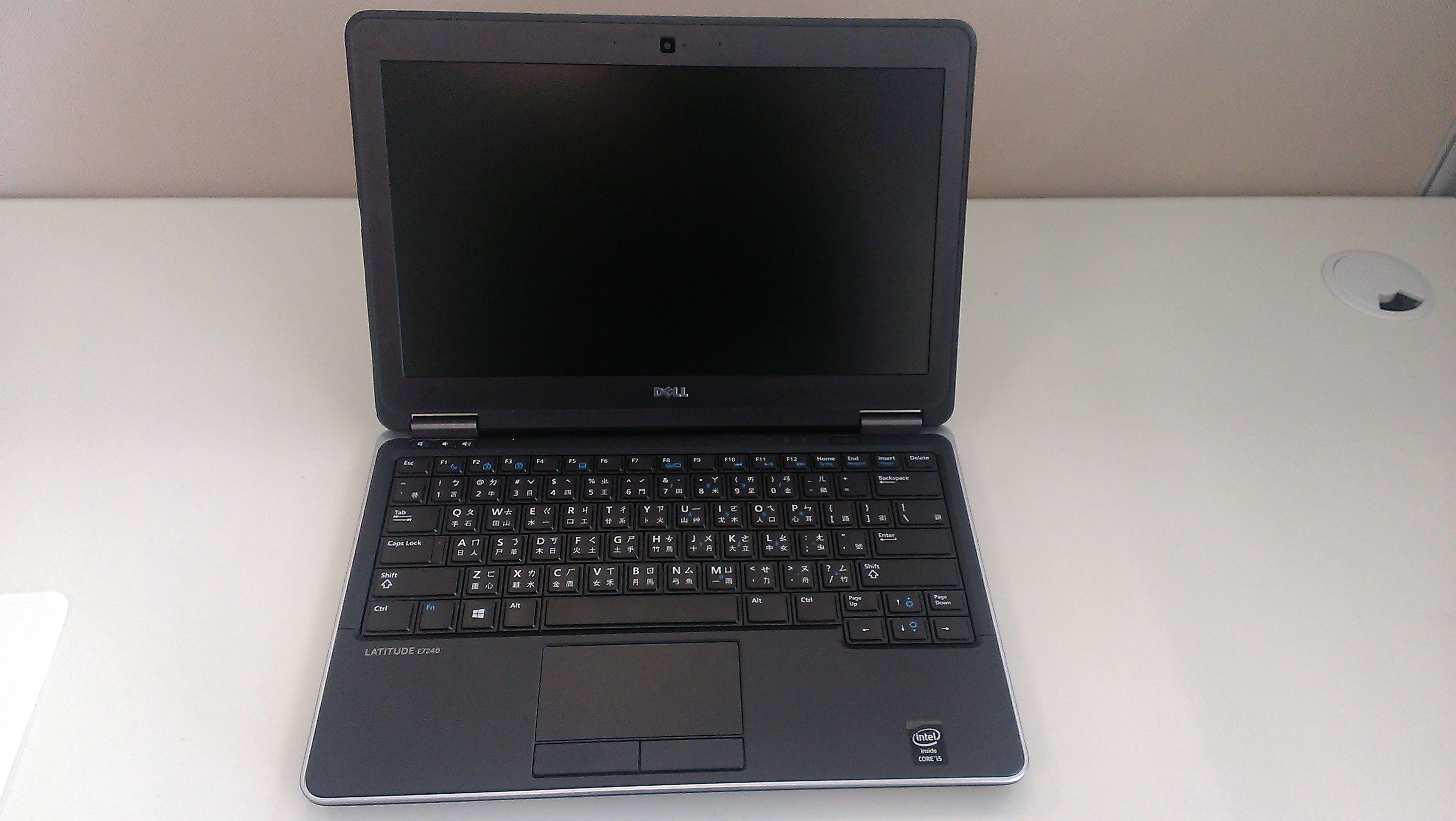 掀開蓋子,型號是 E7240,開蓋後看起來就有 Latitude 的特色了,有完整的獨立方向鍵,Page Up/Page Down 鍵,鍵盤顆粒似乎小了一些些,我的手指不算粗,加上鍵程還算 OK,打起來的感覺算是不錯。而且我很喜歡有獨立音量、靜音鍵的設計,有時候臨時要靜音時不會找不到