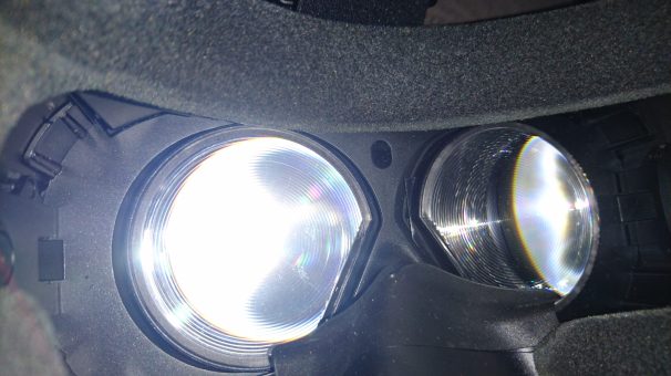 雖然VIVE的規格是同期的產品中最高的(兩眼各1K,所以算2K)但是紗窗效應還是有點影響體驗,另外,他的鏡片是使用一種叫做菲涅爾透鏡(Fresnel lens)的東西,跟一般凸透鏡比起來可以做到更輕更薄,但是我覺得只有中間看起來最清楚,但是往旁邊看就會有點模糊,所以在玩VIVE的時候還是盡量保持眼睛不動脖子動吧!