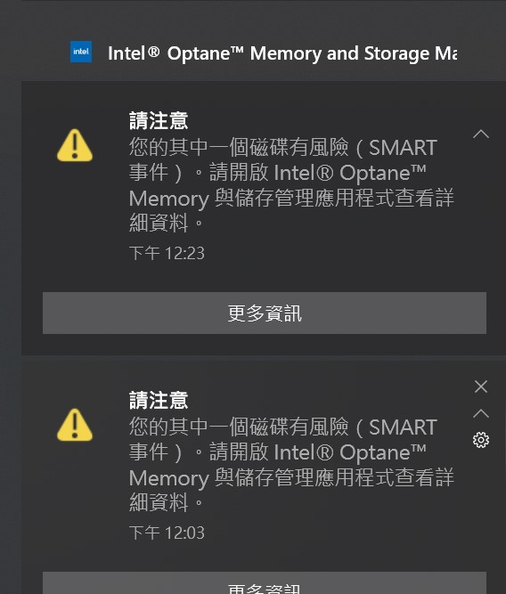以前還流行 DIY PC 時,知道硬碟有這個 SMART 自我偵測資訊可以看,但是這個 Intel 的程式只會顯示狀況正常或異常,不會顯示 SMART 裡的各種數值,每次 Windows 出現警告訊息時打開這個程式來看就顯示正常,只有在 Windows 的事件檢視器看得到和上圖一樣的錯誤訊息,也不清楚具體是哪裡出問題了。