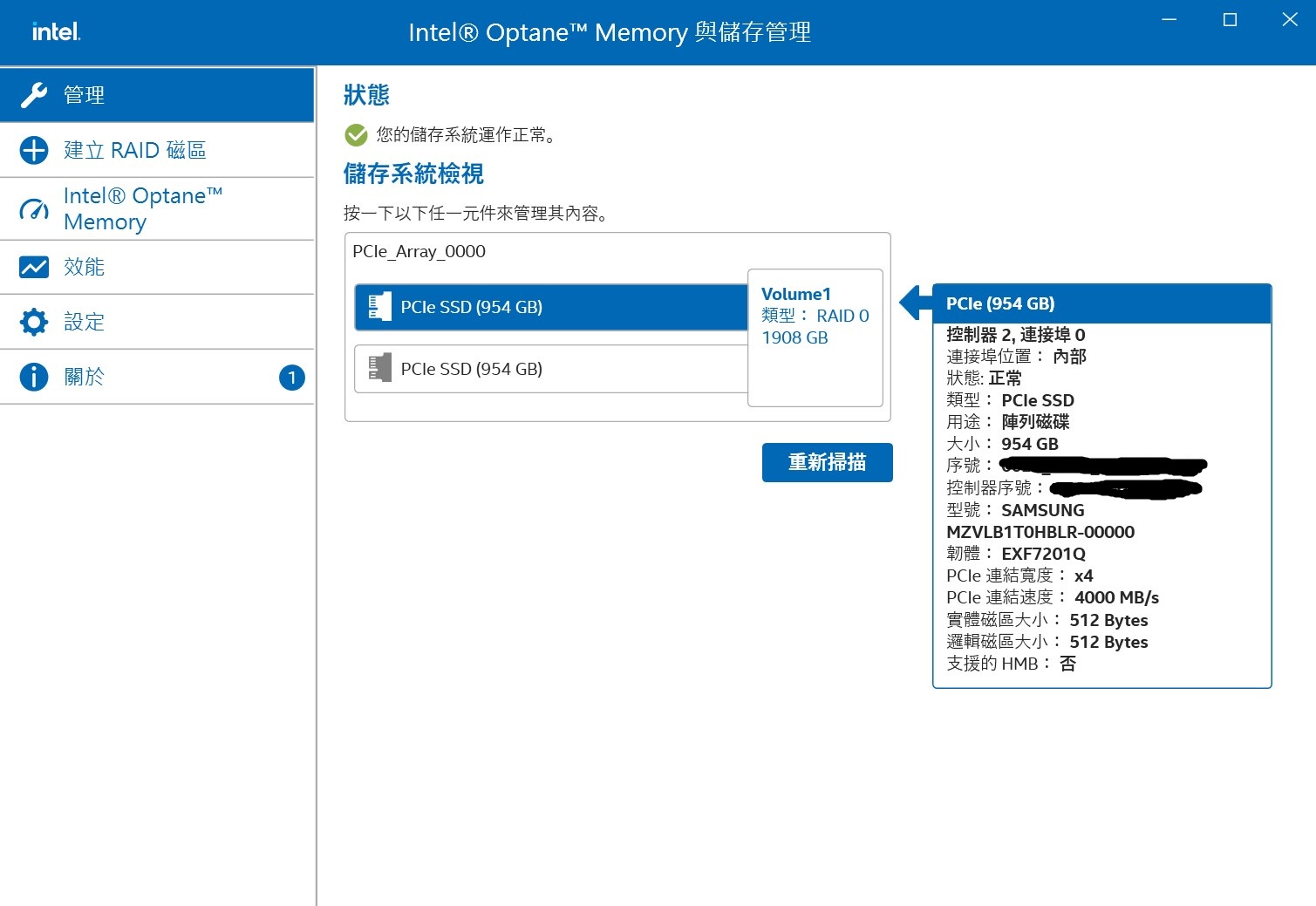 這次的故事要從我的 B9400 無法開機說起,就在某天 WFH 的早上,我準備要開電腦上班時,發現我的筆電無法開機,直接進了 BIOS 然後顯示無硬碟,當時嚇了我一大跳,因為裡頭的工作資料有好一陣子沒備份了,但幸好經過一些無厘頭的步驟後 (拔電源、D 面用手壓一壓…),就恢復正常了,之後這樣子的經驗又發生幾次,由於我這台 B9400 是出廠就設定成 1TB*2 的 RAID 0 機種,所以我自己嘗試著 Google 之後發現可以下載一個所謂的 Intel Optane Memory 與儲存管理 的程式來檢查是不是有問題。