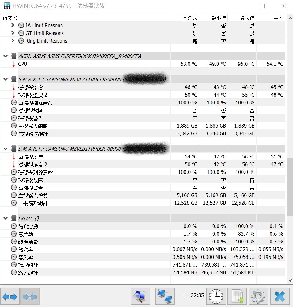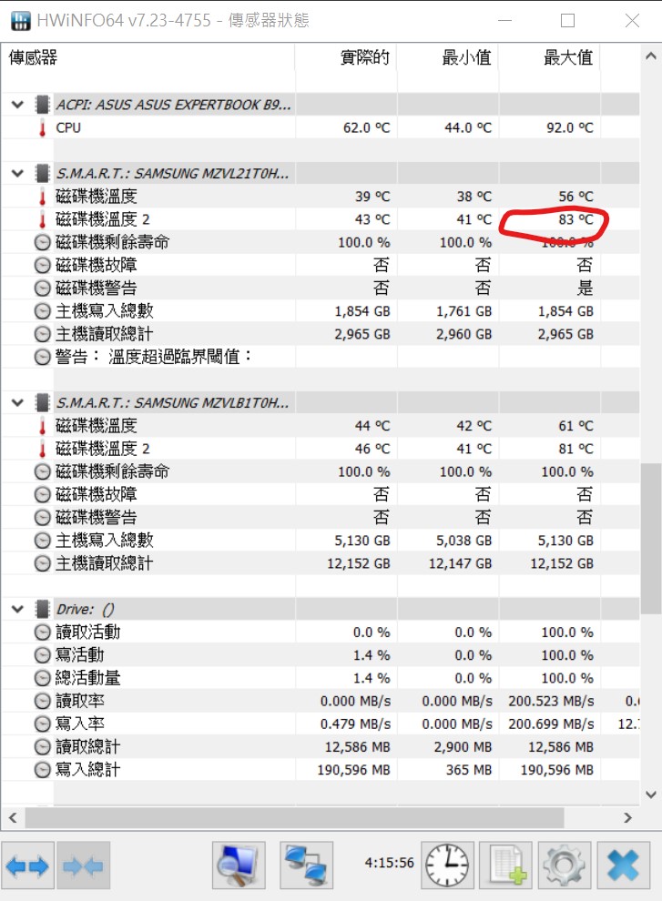 然而好景不常,這次資料倒回去之後還是發生了 Windows 警告訊息,但我這次不想要先跑子龍任務了,來了也修不好的話還更浪費我自己的時間,想說自己做個 USB開機碟跑 SMART 測試看看,自己先找出病根,然後再請工程師到府服務這樣子快一點,但是這時候我下載了新版的 HWiNFO 和 CrystalDiskinfo 軟體,卻發現這兩個軟體都可以正常無誤的在 RAID 0 的 Windows 下執行,然後就被我發現了一個事實:SSD 的控制器溫度很高,而且這顆 83°C 的是 Samsung 980 的 OEM 版本 PM981A,網路上可以查到 980 這顆硬碟有 84°C 問題的一些英文的分享,由於我的 HWiNFO 是設定成 6 秒更新一次,所以我自己判斷這可能是主要的原因。